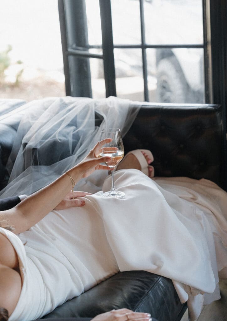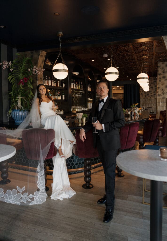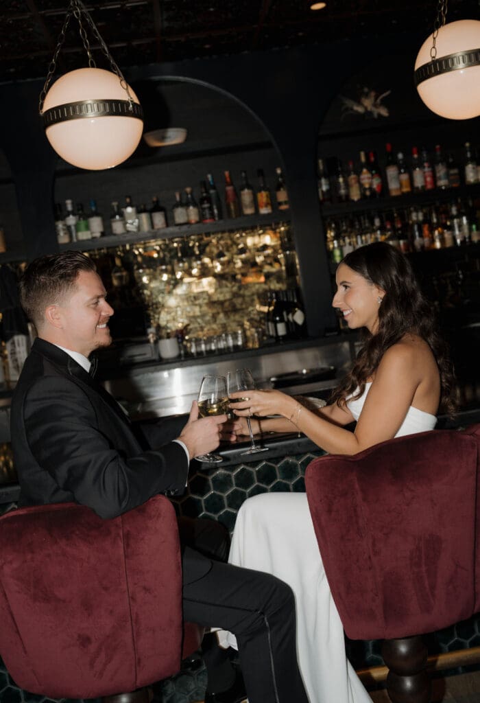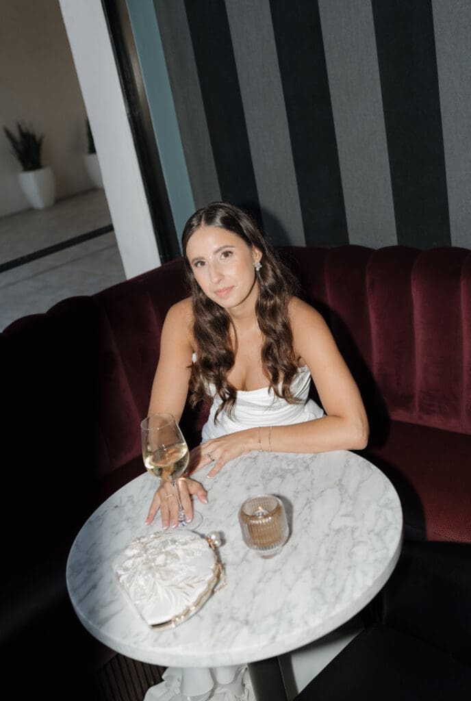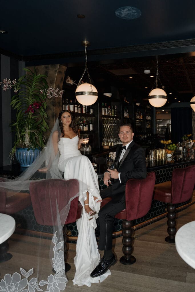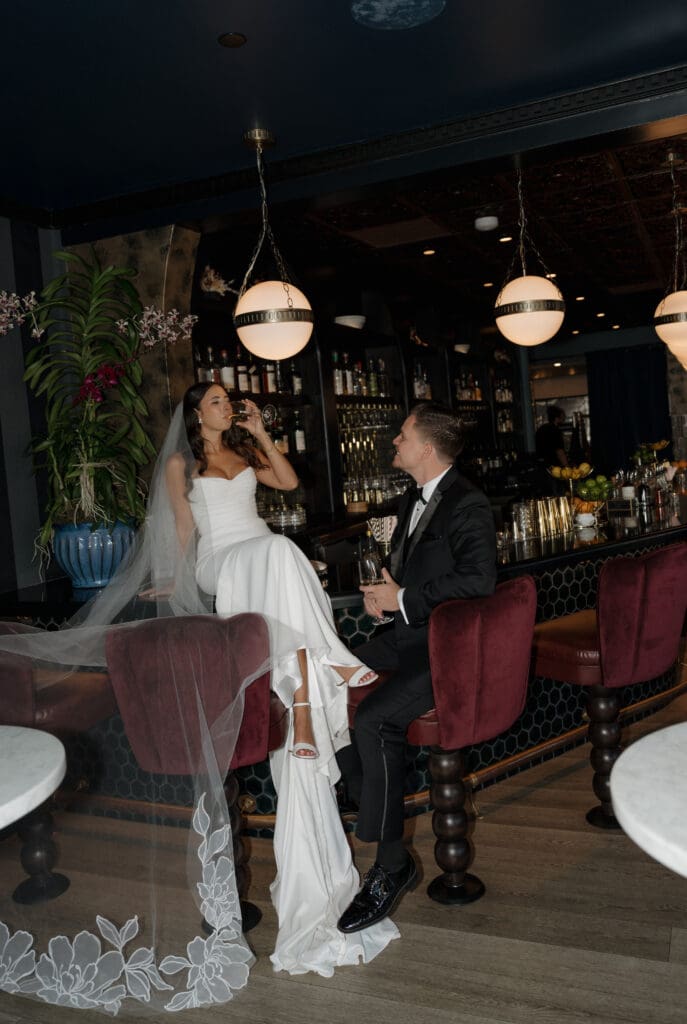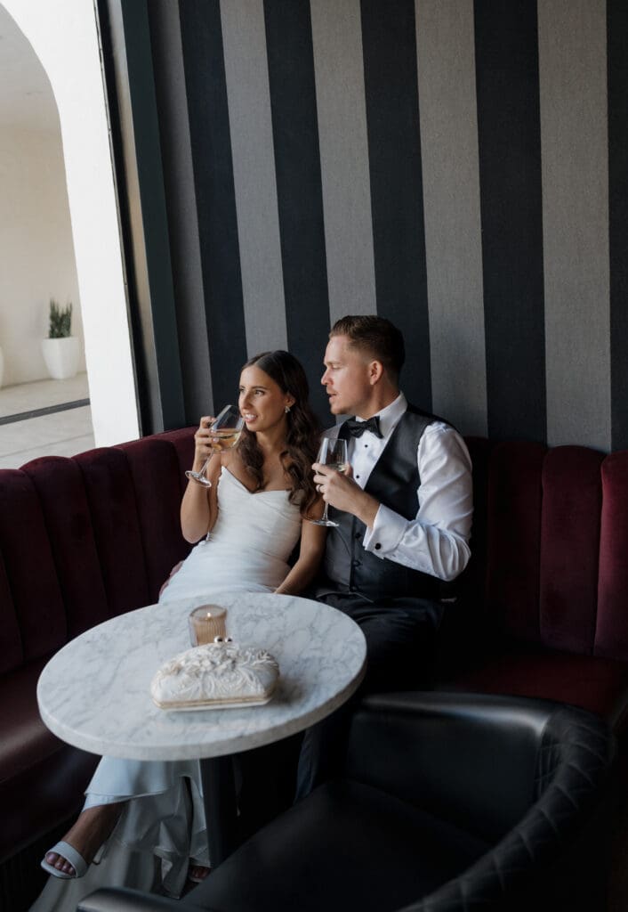 Following M + D’s nuptials, the celebration continued with an intimate cocktail hour in Montecito. After their ceremony, we met at Lion’s Tale for a private toast to their new life together. Velvet textures, fun flash, and softly clinking glasses set the tone for an effortlessly elevated bridal session—equal parts refined and celebratory.