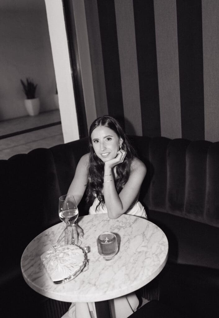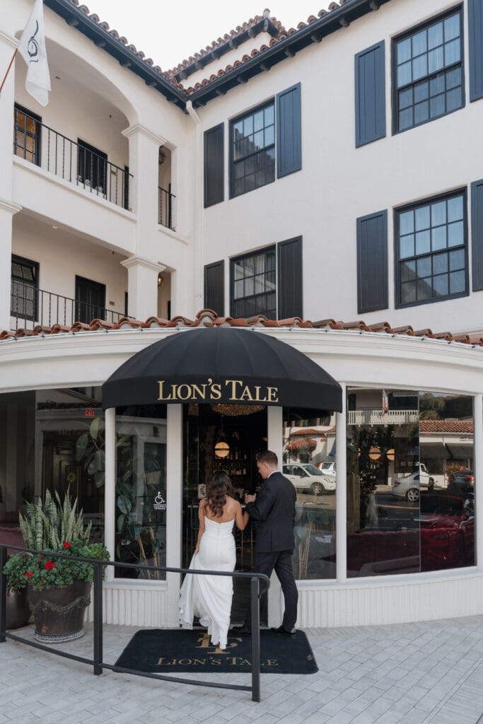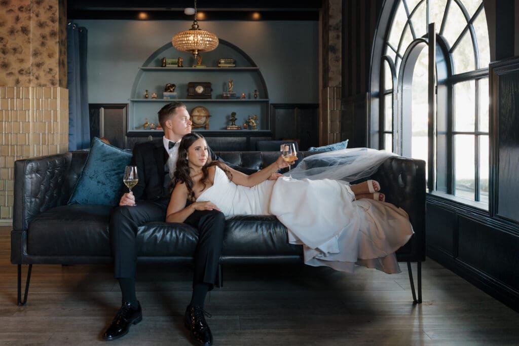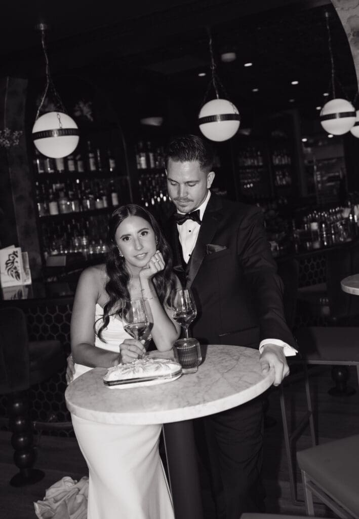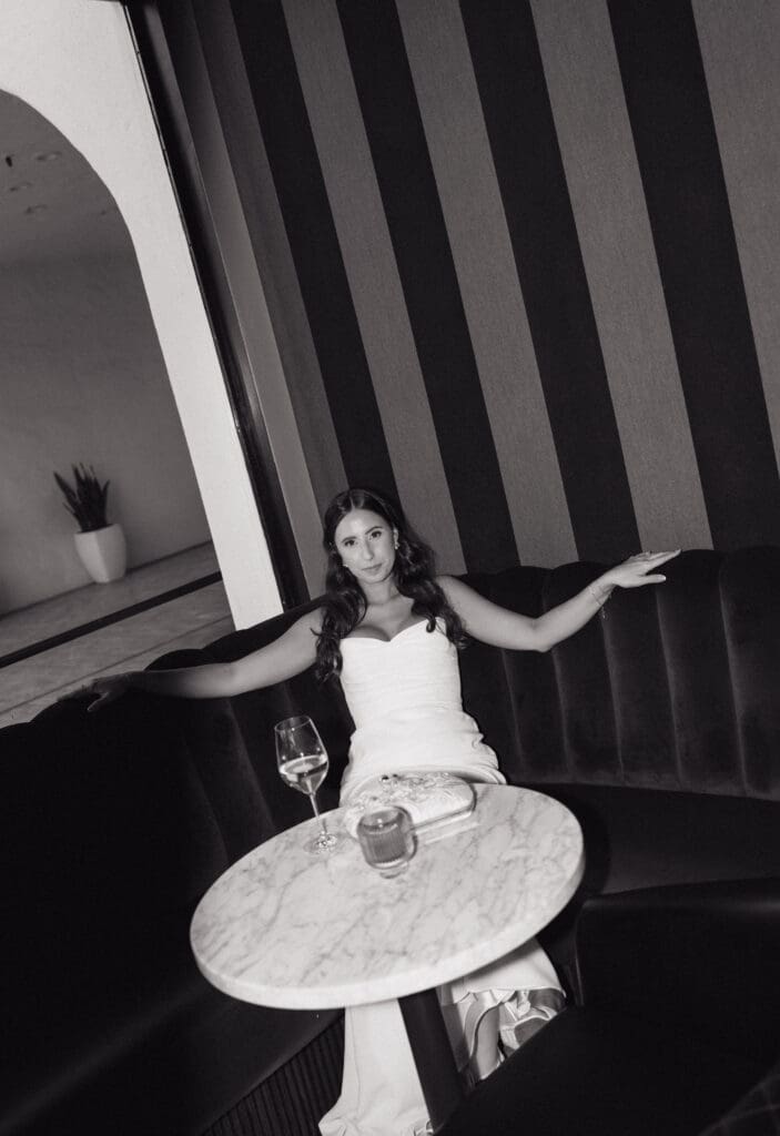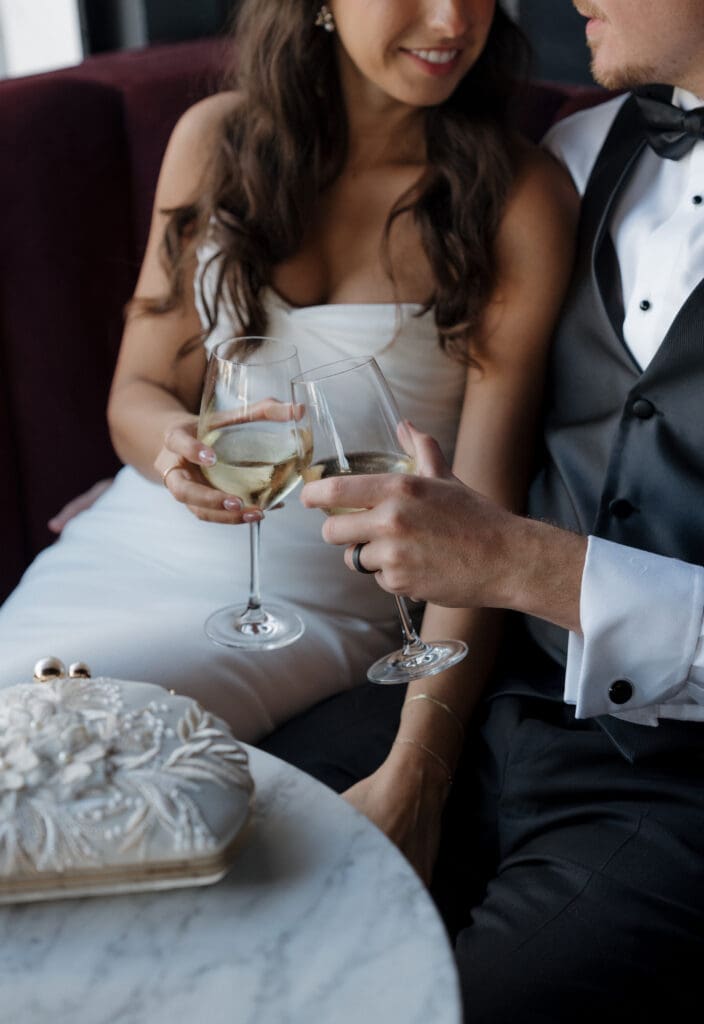 Following M + D’s nuptials, the celebration continued with an intimate cocktail hour in Montecito. After their ceremony, we met at Lion’s Tale for a private toast to their new life together. Velvet textures, fun flash, and softly clinking glasses set the tone for an effortlessly elevated bridal session—equal parts refined and celebratory.