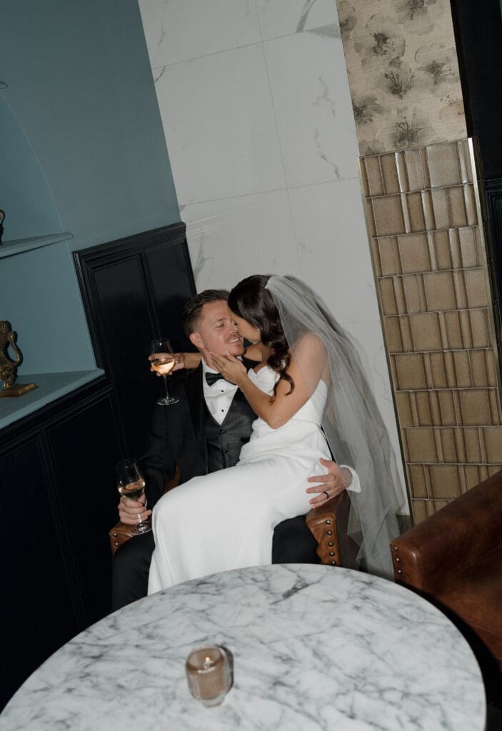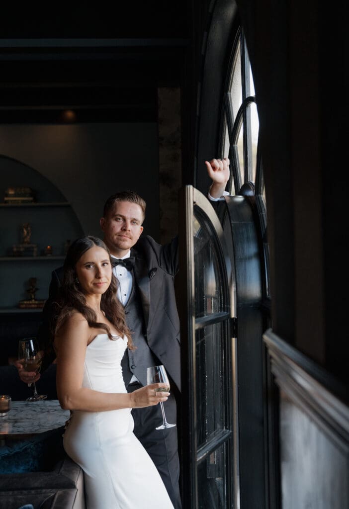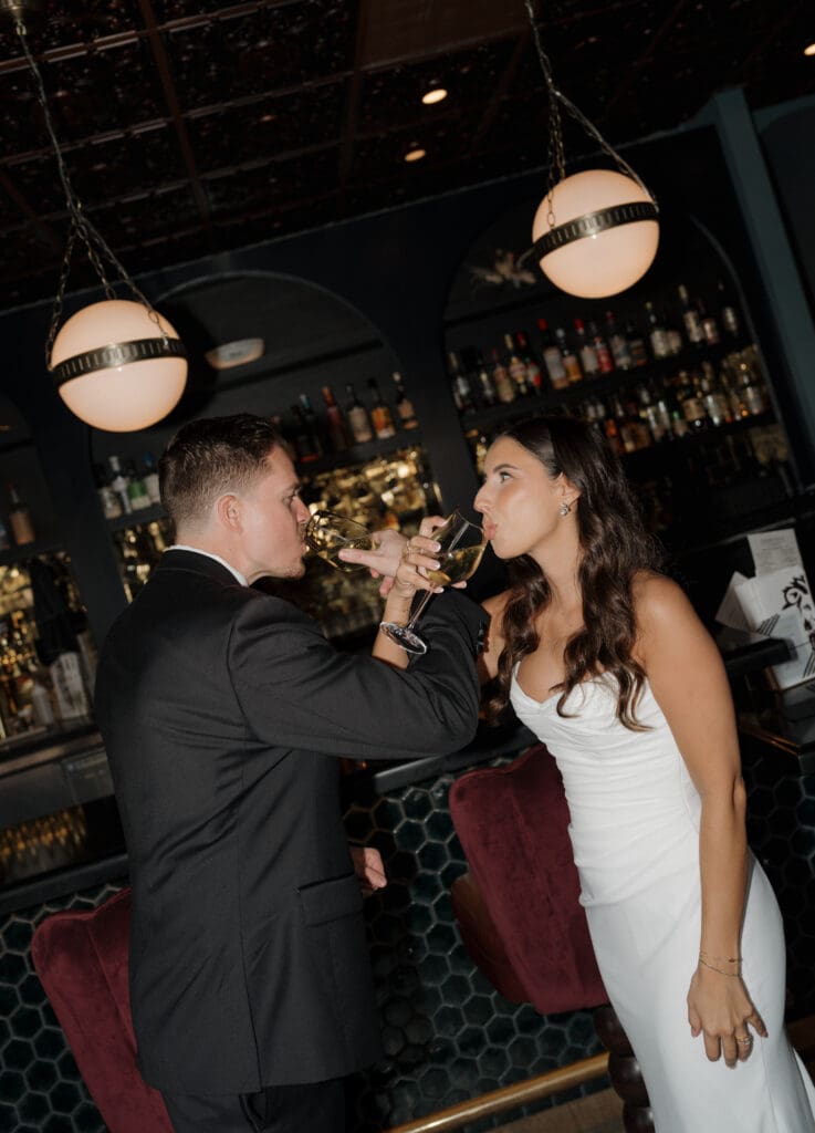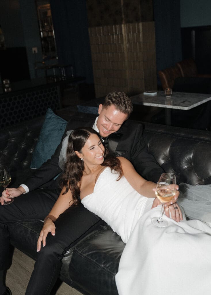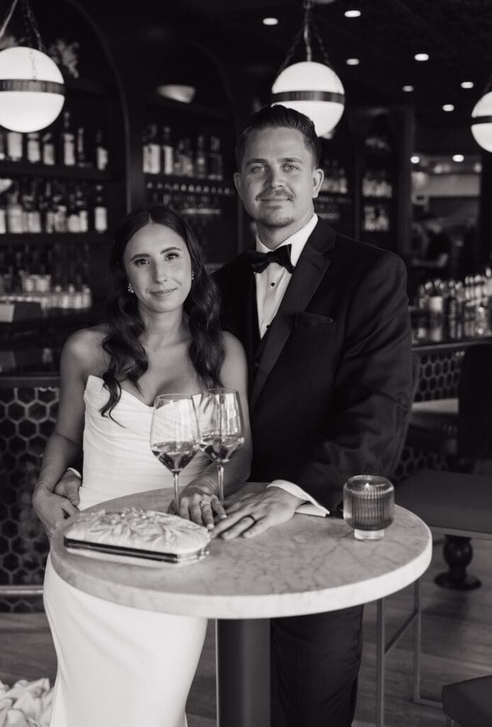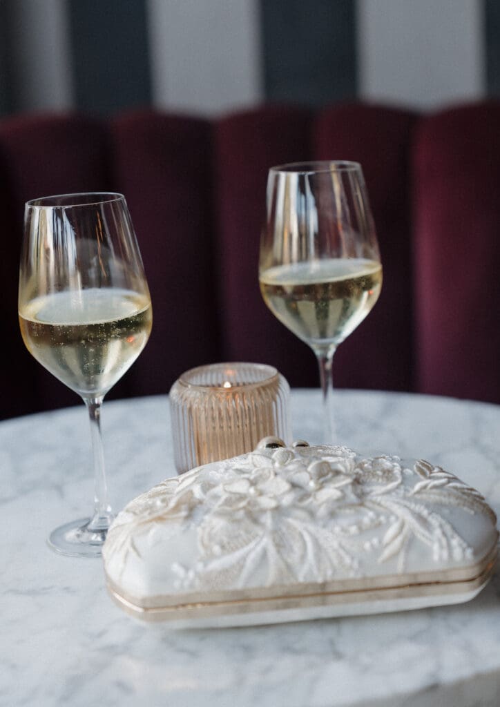 Following M + D’s nuptials, the celebration continued with an intimate cocktail hour in Montecito. After their ceremony, we met at Lion’s Tale for a private toast to their new life together. Velvet textures, fun flash, and softly clinking glasses set the tone for an effortlessly elevated bridal session—equal parts refined and celebratory.