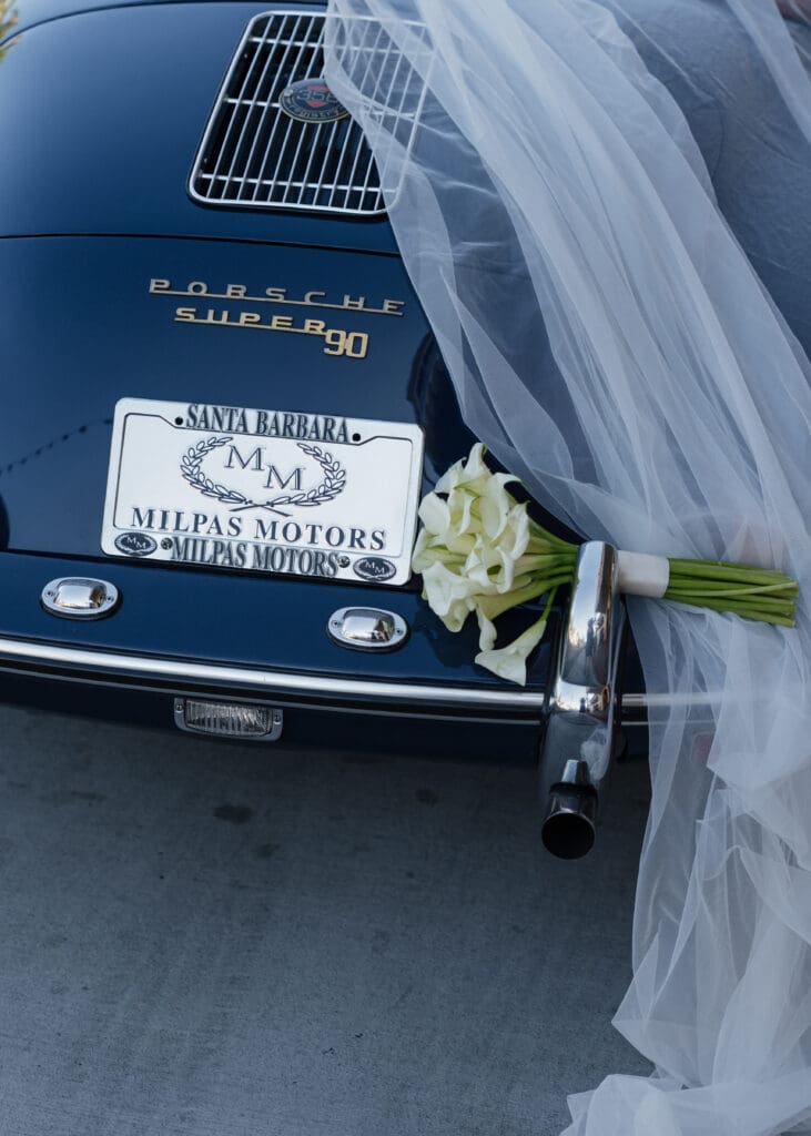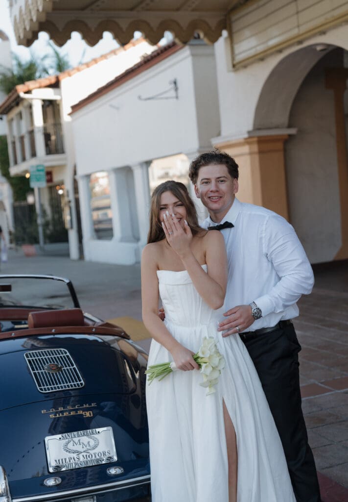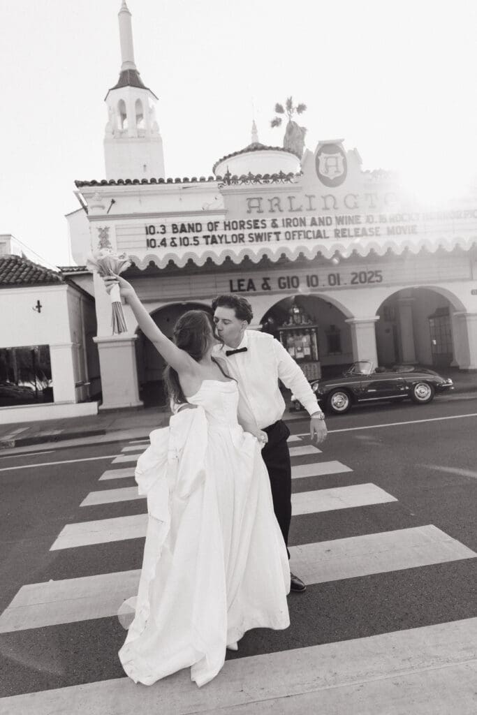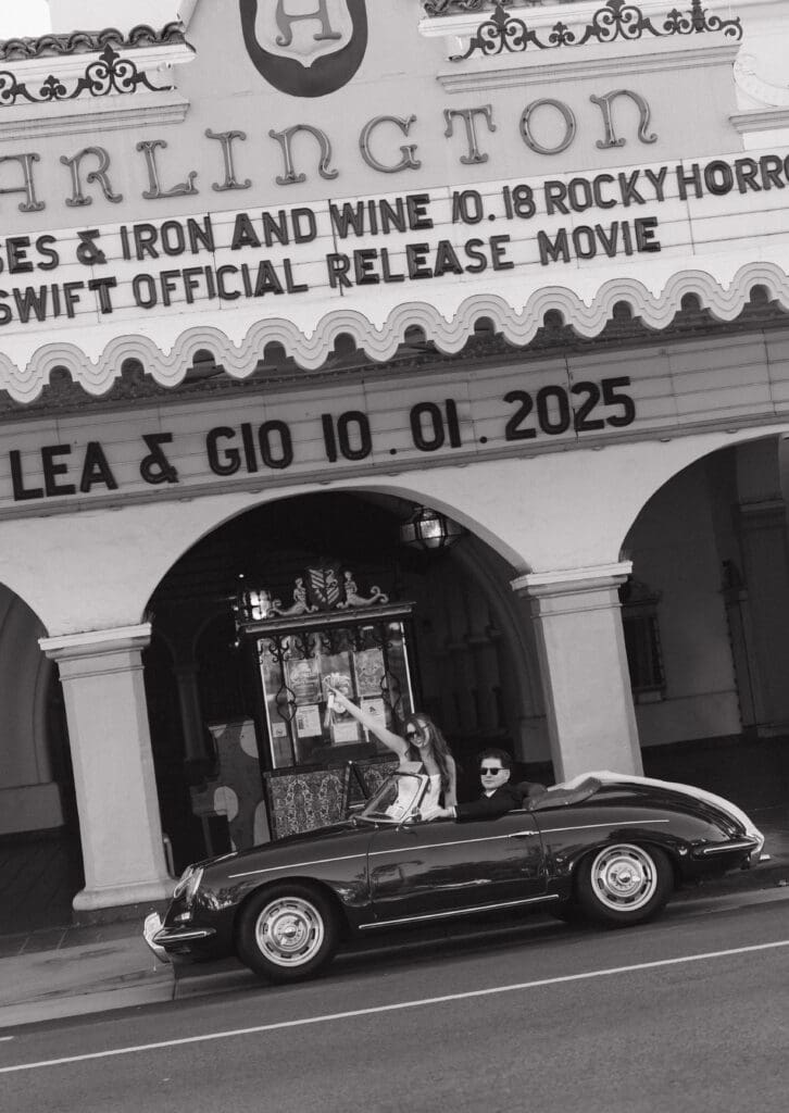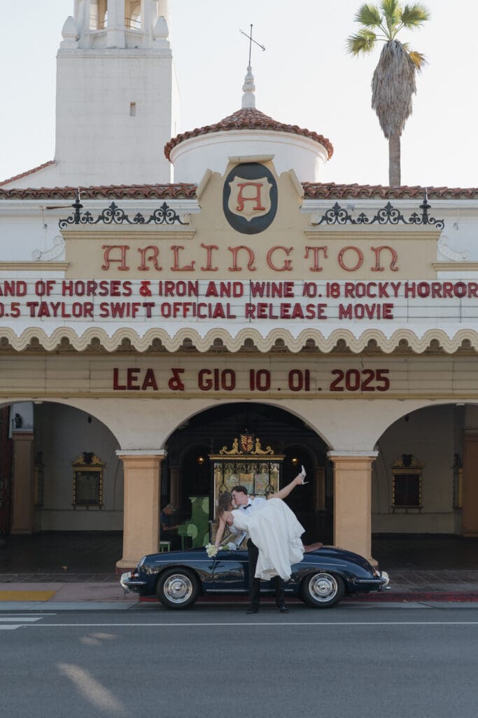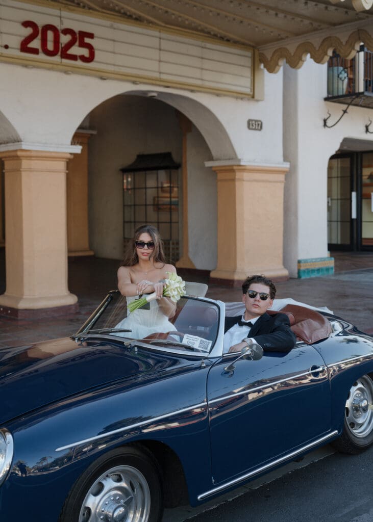 This is what an editorial elopement can look like: courthouse vows, a downtown stop beneath the Arlington marquee, cruising the coast in a vintage Porsche, and a champagne finish at Butterfly Beach. Proof that intimate can still feel elevated.